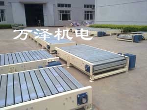 鏈板輸送機(jī)以標(biāo)準(zhǔn)鏈板為承載面,由馬達(dá)減速機(jī)為動(dòng)力傳動(dòng);可通過多列鏈板并行,使鏈板輸送機(jī)做的很寬并形成差速,利用多列鏈板的速度差,使多列輸送在無擠壓的情況下變?yōu)閱瘟休斔?,從而滿足飲料貼標(biāo)、灌裝、清洗等設(shè)備的單列輸送的要求,也可以將兩條鏈板輸送機(jī)的頭尾部做成重疊式的混合鏈?zhǔn)沟闷浚ü蓿w處于動(dòng)態(tài)過度狀態(tài),使輸送線上不滯留物料,可以滿足空瓶以及實(shí)瓶壓力和無壓力輸送。